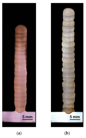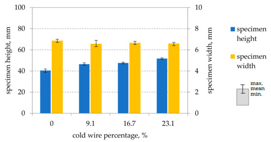 The specimens, consisting of 20 layers, have a height of 40 mm and a width of 6.8 mm when welded without cold wire feed. The addition of a cold wire results in an increase in the specimen height, while the width remains approximately the same. The specimen height increases further with an increasing cold wire percentage (see Figure 3). The increase in specimen height is approximately 28% at a maximum cold wire percentage of 23.1%.