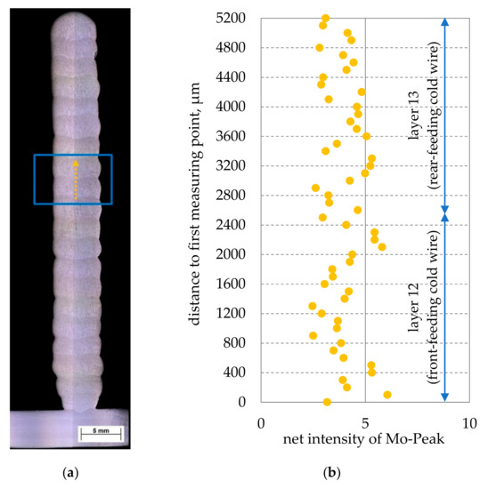 Figure 5. Molybdenum net intensity as a function of the position in the specimen, (a) macrosection indicating the location of the EDS line scan, (b) net intensities of the molybdenum peaks in layer 12 (front-feeding cold wire) and layer 13 (rear-feeding cold wire).
