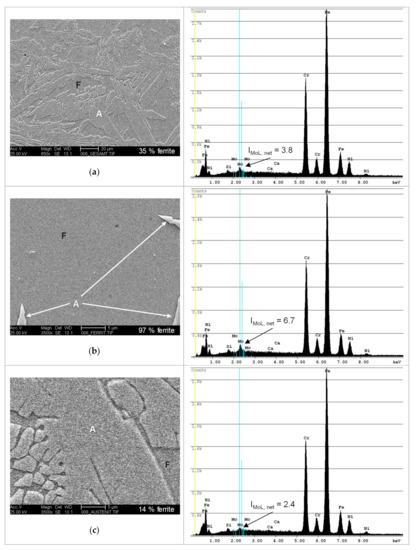 Electron microscopic examination of the analysed areas provides information on the scattering of the molybdenum peak intensities. The EDS spectra (Figure 6 right) show the distribution of elements of the total area in the SEM images (Figure 6 left). The molybdenum peak intensities are mainly dependent on the microstructure percentages in the measured area. A section with an even distribution of ferrite and austenite has an average net intensity of the MoL peak of 3.8 AU (see Figure 6a). If the analysed area predominantly contains ferrite, then IMoL, net = 6.7 AU (see Figure 6b). A predominantly austenitic analysis area results in a significantly lower peak intensity 2.4 AU (see Figure 6c).