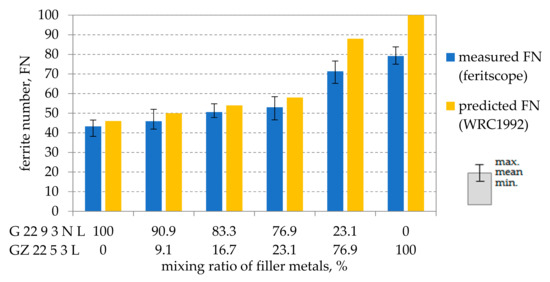Figure 7. Predicted and measured ferrite content of the specimens depending on the mixing ratio of the filler metals.