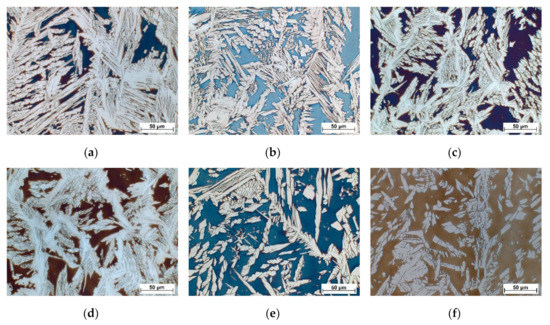 The increase in the ferrite content determined with the Feritscope® can also be seen when looking at the micrographs in Figure 8. The micrographs were taken in the tenth layer of the welded wall structures. Due to etching with Beraha II, the ferritic matrix is brown or blue, and the austenite is white. However, in Figure 8a, only a very low ferrite content is present. This microstructural constituent continuously increases as the nickel content decreases (increase in the percentage of GZ 22 5 3 L from Figure 8a to Figure 8f). The highest ferrite content is found in the weld produced with 100% GZ 22 5 3 L (see Figure 8f).