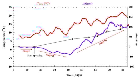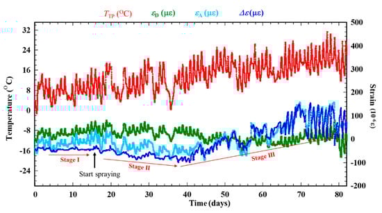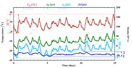 - In stage I of the experiment, Δε had a relative constant signal, with drift decreasing from 5 × 10−6 ε/°C to 1.25 × 10−6 ε/°C under temperature variations.