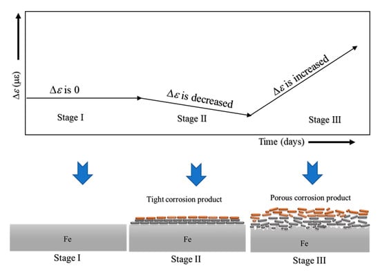 - In stage II, Δε showed a negative trend, indicating the increased thickness of the test piece measured by ACSSM. This was attributed to the tight corrosion product formed on the test piece measured by ACSSM.