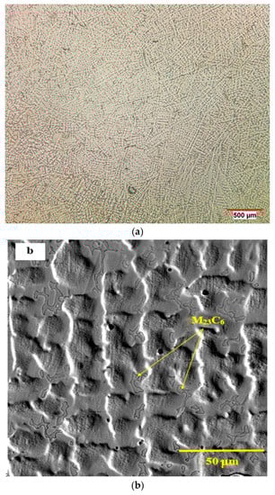 The as-cast structure of the Co–28Cr-5Mo–0.3C alloy is shown in Figure 1. The microstructure consisted of a Cr and Mo rich dendritic matrix γ (Figure 1a), and secondary phases, mainly blocky carbides of the M23C6 type that appeared in the interdendritic regions and grain boundaries (Figure 1b). In general, the M23C6 carbide has been identified as the main secondary phase in this alloy, as well as in alloys of a similar chemical composition [].