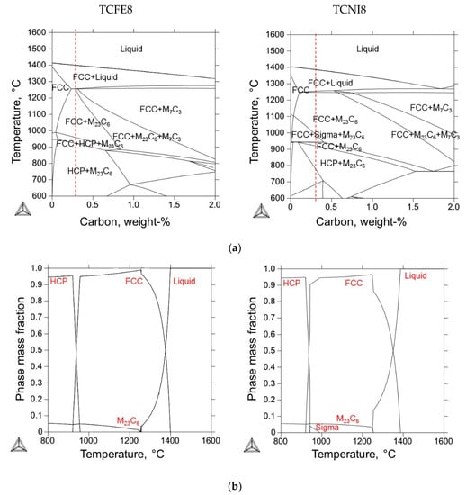 - We used the thermodynamic databases, TCFE8 and TCNI8, for calculations with the ThermoCalc software. Despite observing similarities for the phase transformations at similar temperatures, we also observed some differences, such as the appearance of the sigma phase formation according to the TCNI8 database. The FCC phase also calculated the FCC_L12 and FCC_A1 structures.