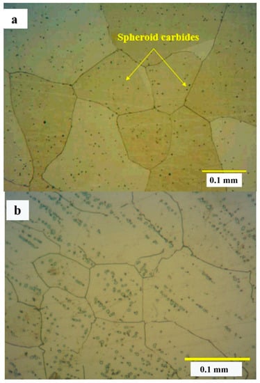 Figure 3, shows the microstructure of the studied alloy after solution treatment and quenching. The solution treatment at 1230 °C for 3 h resulted in nearly the full dissolution of the interdendritic carbides, and it also led to spheroid carbides (Figure 3a). Meanwhile, the solution treatment at 1200 °C for 1 h caused the partial dissolution of the carbides, and therefore, some of the primary carbides remained undissolved in the alloy matrix (Figure 3b).