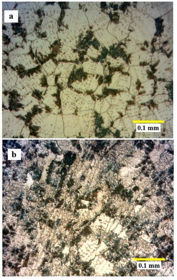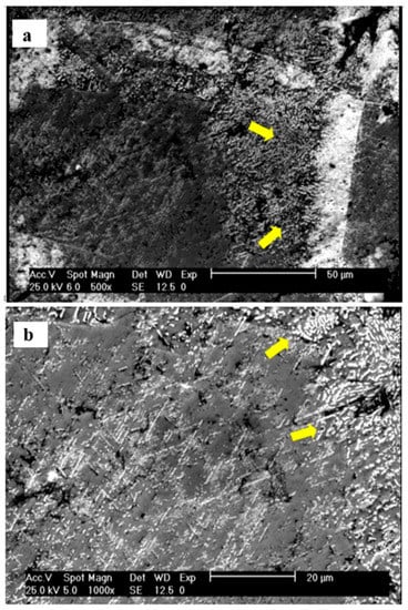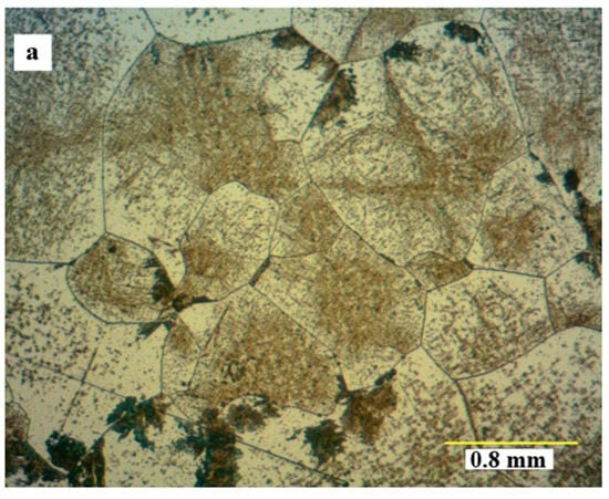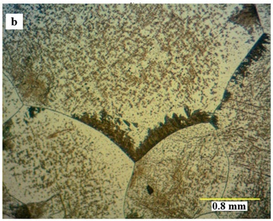 Figure 4a,b, respectively, show the microstructural development of the sample solution treated at 1230 °C for 3 h and then aged at 850 °C for 24 h and 48 h. The formation of the HCP phase is also seen in these figures. Isothermal aging of the solution treated and quenched Co–Cr–Mo–C alloy promotes the FCC- > HCP phase transformation. This phase transformation is composed of two steps that occur simultaneously, that is, the discontinuous precipitation of carbides and the formation of HCP phase. Two microstructurally different forms of the HCP phase, that is, HCP1 (epsilon martensite) and HCP2 (pseudoperlite) might also be constituted []. During aging, the FCC phase transforms into the HCP1 phase as a series of straight bands. These bands become increasingly thick with the increasing aging times. The martensite also nucleates preferentially at the FCC grain boundaries, developing a morphology that resembles pearlite (a constituent typical of carbon steels), and it is known as the HCP2 phase. This appearance results from the formation of carbides along with the development of the martensite phase [].