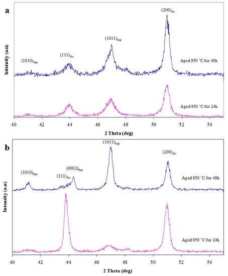 Figure 5a shows the X-ray diffraction patterns of the samples presented in Figure 4a,b. According to Figure 5a, the relative intensities of the (1010)HCP and (1011)HCP diffraction peaks increased with the aging time. The HCP peak intensity enhancement indicates the FCC- > HCP phase transformation development during aging. Isothermal aging of the nearly fully solution treated sample at 850 °C leads to the formation of HCP1 as discontinuous bands, which continually grow and form continuous bands (Figure 4a,b).