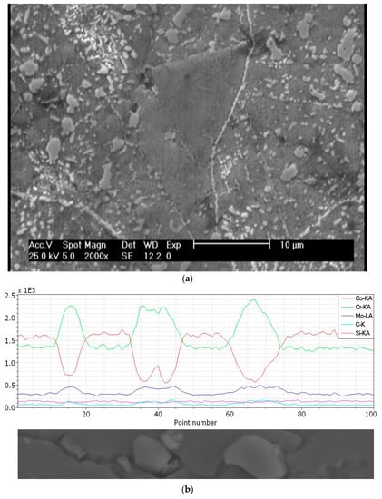 As can be seen in Figure 8b, the EDS compositional profile with distance indicates that the Cr content drops continually in the matrix as the distance from the undissolved carbide interface increases. However, the grain boundary regions, as nucleation sites for the HCP2 phase, were found to be slightly richer in Cr and Mo than the Co-matrix due to the preferential segregation of these elements []. As a result, the HCP2 phase easily forms during aging and it easily grows further with an increase in the aging time.
