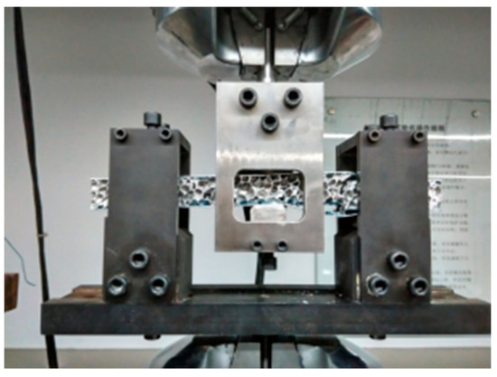 The AFS samples made for the mechanical tests were 300 mm long, 50 mm wide and 27 mm in thickness. Peel strength test was carried out by WDW-10 universal testing machine (Loading speed 25 mm/min) to test the joining strength of the two kinds of AFS samples according to the GB T1457-2005 [28]. Three-point bending fatigue test was carried out by MTS-809 fatigue test machine with the self-made fixture (Span length 200 mm), as shown in Figure 2, according to the ASTM C393 [27]. The AFS samples were tested at loading ratios R = −0.1, cycle frequency C = 7 Hz. A digital camera was used to record the fracture process to describe the fatigue behavior.