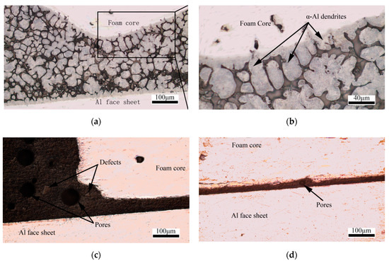 Figure 3 shows the two kinds of AFS joining interface microstructure. As shown in Figure 3a,b, the seam of metallurgical joint is a soldering Zn-Al alloy which have a typical eutectic structure. α-Al dendrites nucleated on the substrate surfaces of the Al sheet and foam core and grew into the Zn-Al alloy fusion area. This indicates that the molten ZnAl alloy have good wettability on the substrate surface and the interfaces of the ZnAl joining alloy and the substrates are intimate. Furthermore, the fusion is compact and continuous without any obvious macroscopic defects. Figure 3c,d present that the joint interface of the adhesive AFS sample is a typical physical joint with many obvious defects such as holes and irregular inclusions, which might be formed during the adhering process. The air between Al alloy sheets and Al foam could not be all pulled out, and the remain air in the adhesive might form the air holes when adhesive melts. Moreover, during the melting and remodeling process, the thermoplastic glue film would shrink and also form hole defects. The final result is that the physical joint is irregular and the connection between adhesive and substrates might be not tight, which lead to poor strength of the adhesive joint.