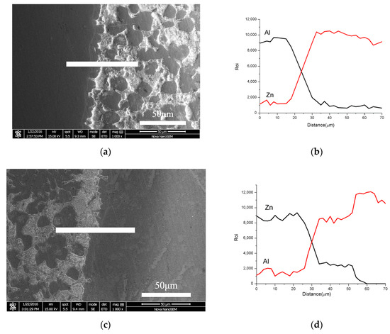 The elemental composition of the interface between the Zn-Al alloy fusion and the substrates of Al sheet and foam core is shown in Figure 4. The main elements across the interface (Al in sheets and foam core, Zn in Zn-Al alloy) are continuous. It indicates that the mutual diffusion of Aluminum and Zinc atoms occurred in the process of metallurgical joining. Figure 4c,d shows that the contents of Zinc atoms and Aluminum atoms change linearly and continuously from the Zinc-rich seam to the Aluminum-rich area within a certain diffusion distance. The molten Zn-10Al alloy has good wettability and diffusion on the surface of the Aluminum substrate during hot-dip coating and metallurgical joining process. The inter-diffusion greatly improves the joining strength.