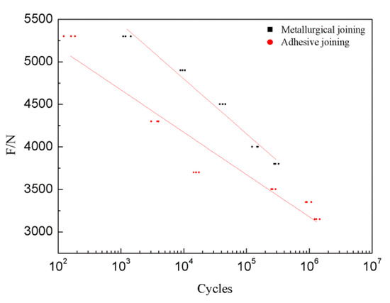 Since N is cycles, we define the fatigue limit as the force when fatigue life is about 5 million cycles [36]. According to Equations (1) and (2) above, the fatigue limit of metallurgical joining samples is 3058 N, adhesive joining samples is 2829 N (see Table 2). Besides, since it is the estimating limits, for further research more factors should be considered such as the strain degradation of pure foams [37].