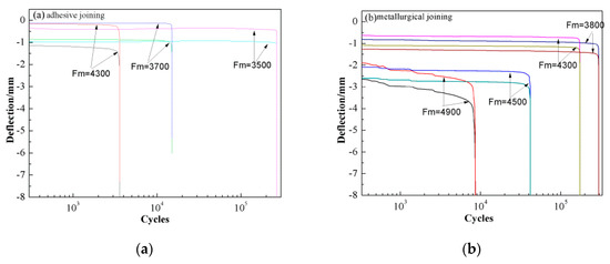 The deflection curves of the two kinds of samples for various stress levels are shown in Figure 8. At the beginning, the fatigue response comprised a slow rate of accumulation of deflection with increasing cycles. The defects in the incubation period grew slowly and steadily due to the microdamage development. When microdamage developed to a critical collapsing level, the inner crake rapidly grew and the rate of deflection increased dramatically, which means the end of the incubation period and the coming of failure. Comparing Figure 8a with Figure 8b, the critical collapsing level of the metallurgical joining samples is much higher than the adhesive joining samples at the same loading force. These behaviors above are similar to that noted by Harte et al. [35].