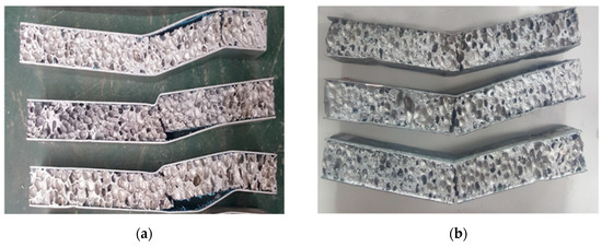Figure 6 shows the fracture morphology of two types of AFS samples after the peel strength test. For the metallurgical joining AFS, the main destroyed part was not the hot-dip coating but the Al foam core, as shown in Figure 6b. That means the strength of the joint is higher than the Al-foam core. In contrast, for the adhesive ones, the glue film and the sheets were nearly completely detached, which means the strength of the joint is lower than the film itself and the AF core. It may result from the defects made during the heat press process in the adhesive area.