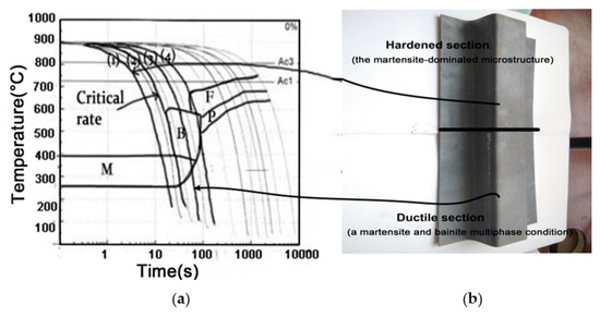 The analysis of transformation products is based on the continuous cooling transformation (CCT) diagram of B1500HS high strength steel shown in Figure 1a [6]. According to the CCT diagram, the quenching rate less than the critical cooling rate (for example, as shown by curve 3 in Figure 1a) will result in the formation of softer phases, such as ferrite and bainite. When the quenching rate is higher than the critical cooling rate (for example, as shown by curve 1 in Figure 1a), a fully martensitic condition is formed. Therefore, by controlling the cooling rate of the blank, it is possible to form regions of very high strength and regions of low strength but high ductility, resulting in a component with tailored mechanical properties. George et al. [7] produced a lab-scale hot-formed B-pillar by controlling die temperature and studied the microstructure and properties of the anti-invasion area and the energy absorption area. They achieved a hardness and ultimate tensile strength (UTS) of the energy absorption area that was reduced by 52% and 49%, respectively, compared with the anti-invasion area. Zhang et al. [8] performed similar studies with die temperatures up to 500 °C and achieved hardness levels of 230 HV in the slow cooling zone and 470 HV in the quenching zone. Zhou et al. [9] reported a UTS of approximately 916 MPa in the tailored region compared with a UTS of approximately 1411 MPa in the fully hardened region. Omer et al. [10] designed fully martensitic rails and three gradient performance rails, and studied the performance of four kinds of rail configurations. In industrial production, the temperature field of the die changes because of continuous stamping, resulting in changes in the microstructure and properties of the blank. Moreover, water was used as cooling medium in the previous study, which increased the die manufacturing cost and shortened the die life.