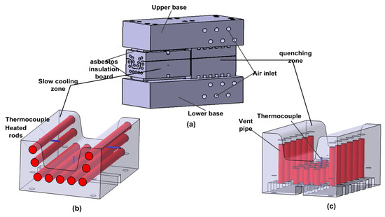 Schematic of the die: (a) overall structure, (b) slow cooling zone, and (c) quenching zone.