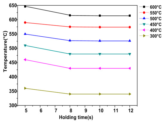 Predicted temperature distribution with a different holding time of (a) 5 s, (b) 8 s, (c) 10 s, and (d) 12 s.