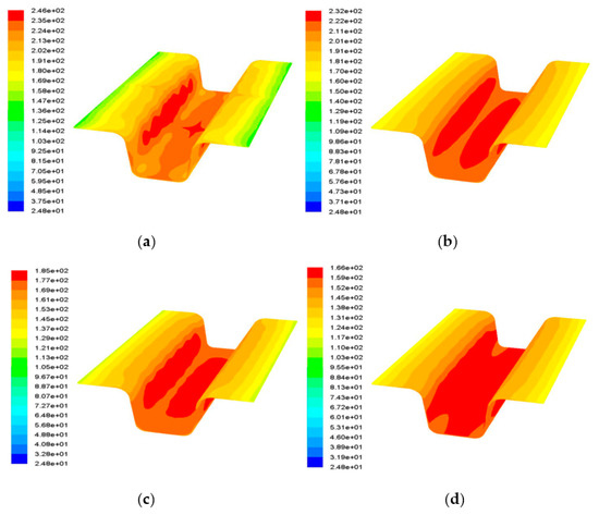 Predicted temperature distribution of the blank at different air flow rates of (a) 1 m/s, (b) 3 m/s, (c) 7 m/s, and (d) 10 m/s.