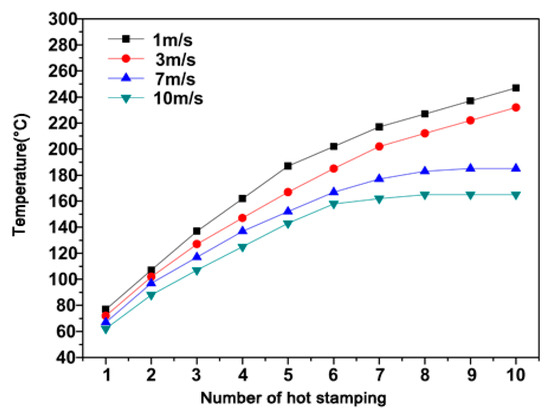 The relationships between the predicted maximum temperature of the as-quenched blanks and the number of hot stampings with various air velocities are shown in Figure 6. The temperature of the as-quenched sheet metal began being consistent after the 8th hot stamping with the air flow speed of 7 m/s. When the gas rate was 10 m/s, the temperature of the as-quenched blank was stable after the 6th hot stamping. The larger the air velocity was, the earlier the temperature of the blank tended to be stable. However, if the air velocity was much too fast, the cost of equipment would increase. In summary, the optimum airflow rate was chosen to be 7 m/s.