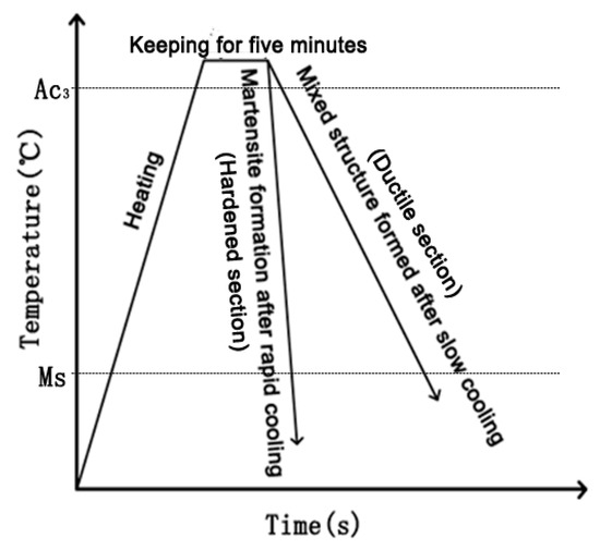 Hot stamping parts of high-strength steel can realize the lightweight of automobiles [1]. However, hot stamping parts of high-strength steel with fully martensitic microstructure (high tensile strengths of approximately 1500 MPa and Vickers hardness values in excess of 425 HV) cannot absorb energy in the event of a car collision due to the low toughness [2]. Therefore, it is necessary to produce parts with tailored mechanical properties to meet the needs of the automotive industry. Common methods of producing tailored parts can be classified into four categories. First, laser welding technology is used to produce tailored parts. Múnera et al. [3] developed components using tailor welded blanks composed of both hot forming steel and steel which is not so easily hardened. Second, partial austenitizing is a feasible process. Mori et al. [4] carried out hot stamping experiments using bypass resistance heating and have obtained parts with a strength distribution. Third, tailored parts can also be obtained by the post-tempering of fully hardened parts. Wang et al. [5] performed experiments with different annealing processes and obtained tailored parts. Fourth, locally reducing the cooling rate of blanks provides an effective way to produce tailored parts. The cooling rate of sheet metal can be reduced locally by changing the temperature of the die. The operation is simple and the parts have good formability and high forming accuracy.