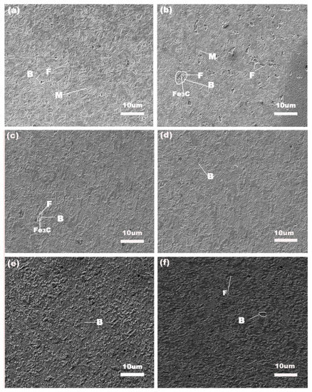 The typical microstructures observed from C1, C2, H1, and H2 locations are shown in Figure 10. It can be seen from Figure 10a,b that the microstructures for C1 and C2 locations exhibited the packets of parallel lath crystals, which are characteristic of martensite [11]. From Figure 10c–f, it can be seen that the characteristic feature of bainite was a ferrite matrix with dispersed cementite particles [12]. As depicted in Figure 10c,d, there was little difference in the microstructures of H1 and H2 positions when the die temperature was 400 °C.