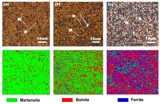 Two-stage color tint etched optical micrographs and the manually generated microstructure images are shown in Figure 11. As shown in Figure 11a, most of the quenched structures were martensite and a small amount of ferrite and bainite. The formation of abundant martensite was because of the higher cooling rate, which was the result of low die temperature. The formation of bainite and ferrite was due to the longer transfer time and the left shift of the CCT, which was caused by the plastic deformation [6]. It can be concluded from Figure 11b,c that both die conditions resulted in a martensite and bainite multiphase condition with visibly larger amounts of the softer bainite phase for the 600 °C die condition.