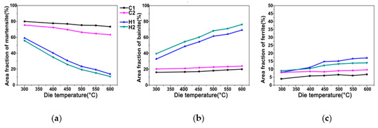 The area fractions of martensite, bainite, and ferrite are shown in Figure 12. With the increase of die temperature, the area fractions of quenched phases at C1 and C2 positions had the same trend. The area fraction of martensite at the C1 and C2 positions were above 74% and 64%, respectively. The proportion of ferrite and bainite at the C1 and C2 positions was small. For the H1 and H2 specimen locations, there was a strong downward trend of martensite and a strong increase in bainite, and the ferrite had a slight change, which was owed to the increasing die temperatures. As the tool temperature increased from 300 to 600 °C, on the one hand, the area fraction of bainite at the H1 position rose from 32% to 68%, and at the H2 position, the area fraction of bainite increased from 38% to 74%. On the other hand, the area fraction of martensite at the H1 position dropped by 80%, and at the H2 position, the area fraction of martensite decreased by 80.7%. The proportion of ferrite at the H1 and H2 positions was small. The martensite content on the bottom of the part (C1 and H1) was higher than that on the side (C2 and H2), as C1 and H1 made contact with the tool first.