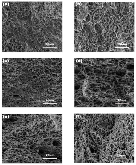 Figure 15 shows the fracture morphology at locations C1 and H1. At location C1, the fracture surface was planar and there were some very shallow and small dimples. Therefore, the fracture behavior was brittle fracture. This further confirmed the high strength and low toughness of the hardened zone mentioned above. At location H1, the fracture surface was dark grey and classic cup-shaped, and some large and deep dimples could be clearly observed. The fluctuation of the fracture surface increased when the die temperature exceeded 400 °C. Therefore, the fracture behavior was ductile fracture, matching the high toughness and low strength of the ductile zone mentioned above.
