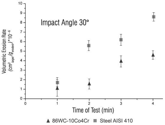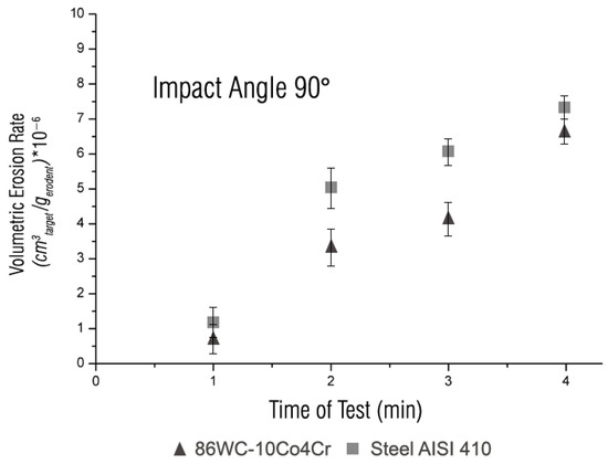 - For the impact angle of 30, the tungsten carbide coating presented a cumulative volumetric erosion rate of approximately 50% less than martensitic stainless steel.
