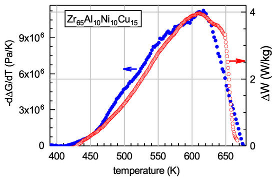- Makarov, A.S.; Afonin, G.V.; Mitrofanov, Y.P.; Konchakov, R.A.; Kobelev, N.P.; Qiao, J.C.; Khonik, V.A. Relationship between the heat effects and shear modulus changes occurring upon heating of a metallic glass into the supercooled liquid state. J. Non-Cryst. Sol. 2018, 500, 129–132. [Google Scholar] [CrossRef]