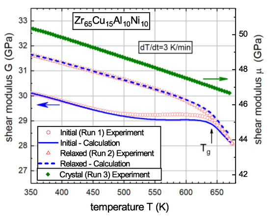 - Makarov, A.S.; Mitrofanov, Y.P.; Afonin, G.V.; Kobelev, N.P.; Khonik, V.A. Predicting temperature dependence of the shear modulus of metallic glasses using calorimetric data. Scr. Mater. 2019, 168, 10–13. [Google Scholar] [CrossRef]