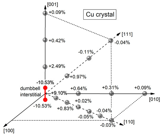 - Holder, J.; Granato, A.V.; Rehn, L.E. Experimental evidence for split interstitials in copper. Phys. Rev. Lett. 1974, 32, 1054–1057. [Google Scholar] [CrossRef]