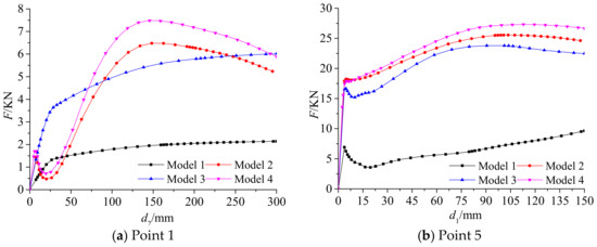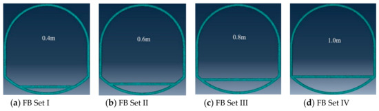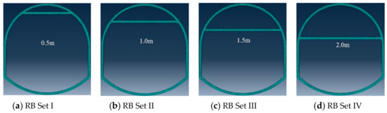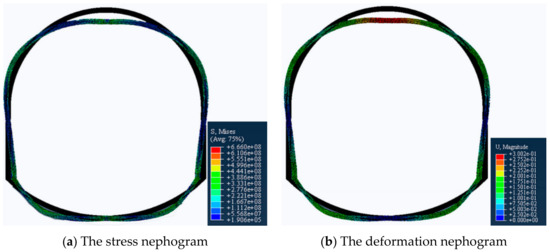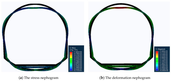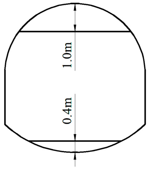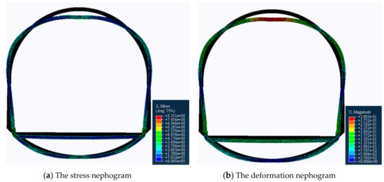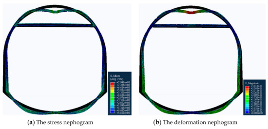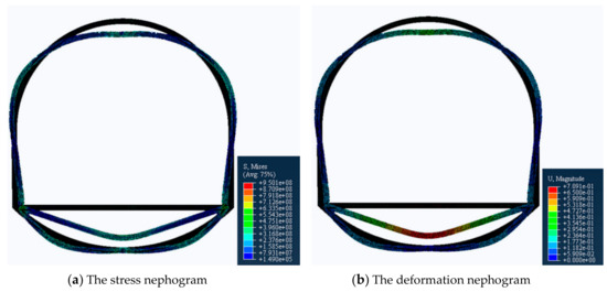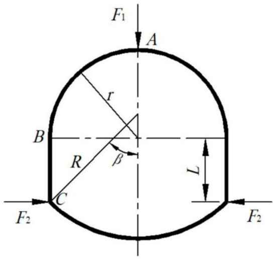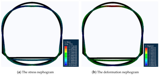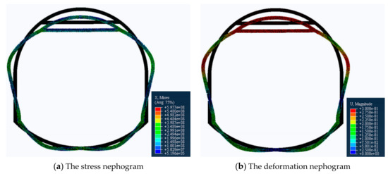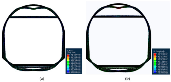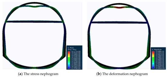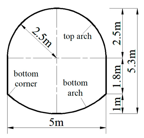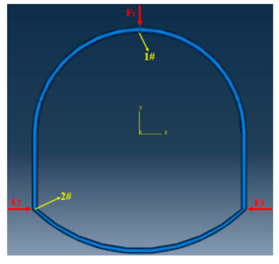- Since the deformation of the roof and the two sides are equal in any direction [27], we set the load of the top arch and the two sides to be equal. Specifically, a vertical downward displacement load of 0.3 m is applied to the top arch, a horizontal leftward 0.15 m displacement load is applied to the left bottom corner, and a horizontal rightward 0.15 m displacement load is applied to the right bottom corner.