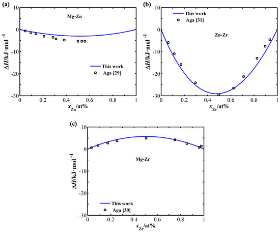 Calculated mixing enthalpy of liquid Mg-Zn (a), Zn-Zr (b), and Mg-Zr (c) alloys with experimental data and calculated Calphad-data from the literature [29,30,31].