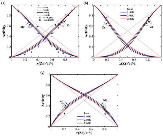 From Figure 3a, the calculated activity values for Mg-Zn binary alloys have been compared with experimental values [36,37], and the present calculated results are in good agreement with the available experimental data in the Mg-Zn system. Because there are no experimental data available for liquid Zn-Zr and Mg-Zr alloys, a further comparison in Zn-Zr and Mg-Zr alloys cannot be performed.