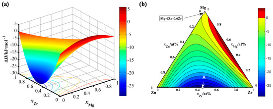 Among the thermodynamic properties of Mg-Zn-Zr alloys, the mixing enthalpies over the whole composition range are calculated by Equations (5)–(9). The composition dependencies of the mixing enthalpies of the liquid Mg-Zn-Zr ternary alloys are illustrated in Figure 5a. To make a more explicit description for the thermodynamic parameters, the curved surfaces in Figure 5a are projected onto a plane and then the rectangular coordinate system is converted into a triangular coordinate system (see Figure 5b). It can be seen that the mixing enthalpies of the Mg-Zn-Zr ternary alloys are positive in the region for low zinc concentration (see the region B in Figure 5b). On the contrary, the mixing enthalpies of liquid Mg-Zn binary alloys are all negative over the whole composition range (see Figure 1). The reason rises from the repulsive interaction between Mg and Zr, which has been discussed in the above statements about the interactions between atoms (see part 1 of Section 3.1). Additionally, it can be seen from Figure 5b that the minimum values of is obtained at the point A (, , ), which is located at the Zn-Zr edge of the composition triangle. This result indicates that there is still a strong attractive interaction between Zn and Zr in Mg-Zn-Zr alloys. Lastly, according to Figure 5b, the mixing enthalpy of the Mg-6Zn-xZr (x = 0~0.6 wt%) alloys can be found to be negative. According to the calculation results by the Miedema model, the values of increase from −0.29 kJ/mol for the Mg-6 wt% Zn-0 wt% Zr alloy to −0.26 kJ/mol for the Mg-6 wt% Zn-0.6 wt% Zr alloy. Therefore, the addition of Zr elements into the Mg-6 wt% Zn alloy can increase the mixing enthalpy.