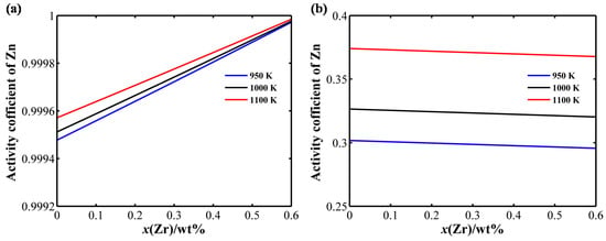 The activity coefficients of Mg and Zn at different temperatures in the liquid Mg-6Zn-xZr (x = 0–0.6 wt%) alloys are calculated by Equations (16)–(20). Because the melting temperature of Mg-6Zn-xZr (x = 0–0.6 wt%) alloys are below 950 K [39], the researched temperatures are selected at 950 K, 1050 K, and 1159 K. The calculation results about activity coefficients of Mg and Zn are shown in Figure 6, which can clearly show the relationships between the mass fraction of the Zr component and the activity coefficients of components in the liquid Mg-6Zn-xZr (x = 0–0.6 wt%) alloys.