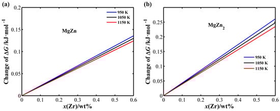 Lastly, from the above calculation results of binary alloys (see part 1 of Section 3.1), it can be found that the Mg-Zr intermetallic compound does not exist and only Mg-Zn and Zn-Zr intermetallic compounds exist in the Mg-6Zn-xZr (x = 0–0.6 wt%) alloys. At the same time, some experimental results reported in the literature prove that the main strengthening phase are Mg7Zn3, MgZn2, and MgZn in Mg-6Zn-xZr (x = 0–6 wt%) alloys [7,8]. Therefore, it can be concluded that research should be the focus on the effect of Zr addition on the formation of Mg-Zn compounds in the Mg-6Zn-xZr (x = 0–0.6 wt%) alloys. That is the reason why only the Gibbs free energy associated with the formation of Mg-Zn compounds are calculated according to Equations (13)–(15) in this paper.