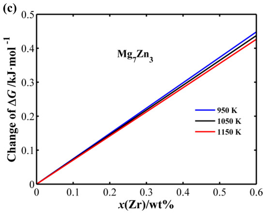 According to Figure 7, it can be found that the change of of Mg7Zn3, MgZn2, and MgZn are all positive and increase with increasing Zr content. These results indicate that the addition of Zr addition increase Gibbs free energies of formation of Mg7Zn3, MgZn2, and MgZn, from which it can be concluded that the addition of Zr hinders the formation of Mg7Zn3, MgZn2, and MgZn. This hindering effect becomes stronger with increasing Zr content. Moreover, the change of Gibbs free energies of Mg7Zn3, MgZn2, and MgZn all become greater with decreasing temperature, which indicates that the hindering effect of Zr addition on the formation of Mg7Zn3, MgZn2, and MgZn become stronger with higher temperatures.
