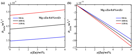 Analogously, according to the above definitions, the Zn composition can only influence the main interdiffusion coefficients () of Zn and the cross interdiffusion coefficient () of Zr. From Figure 9, it can be seen that the absolute values of the main interdiffusion coefficient () of Zn and the cross interdiffusion coefficient () of Zr increase with increasing Zn concentration up to 6wt% in the liquid Mg-xZn-0.6Zr (x = 0–6 wt%) alloys. These results indicate that the increase of Zn content can promote the diffusion of Zn and Zr in the liquid Mg-xZn-0.6Zr (x = 0–6 wt%) alloys, and, consequently, promote the growth of Mg-Zn compounds.
