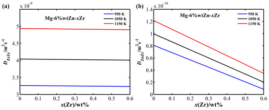 The diffusion rates of Zn and Zr can be determined by the mutual diffusion coefficients in the Mg-6Zn-xZr (x = 0–6 wt%) melt. According to Ding’s prediction model of diffusion coefficients for ternary alloys [16,18], diffusion in a ternary system can be fully expressed by the four interdiffusion coefficients (Dii, Djj, Dij, and Dji). The interdiffusion coefficients are expressed as the following functions of the intrinsic diffusion coefficients and the mole fractions of components (in this paper, where i, j, and k represent components Zn, Zr, and Mg, respectively) [16,18].