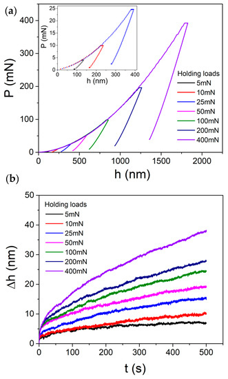 (a) The typical creep P-h curves at various holding depths under Berkovich indenter. P-h curves at shallow depths were enlarged in the inset. (b) Creep displacements at various holding loads were plotted with holding time.