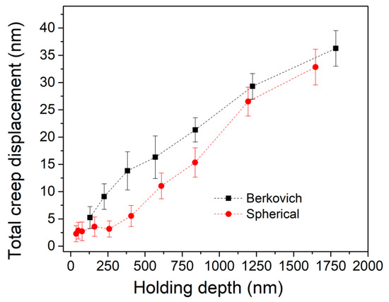 The total creep displacements in the end of holding stage were plotted with holding depth for both indenters.
