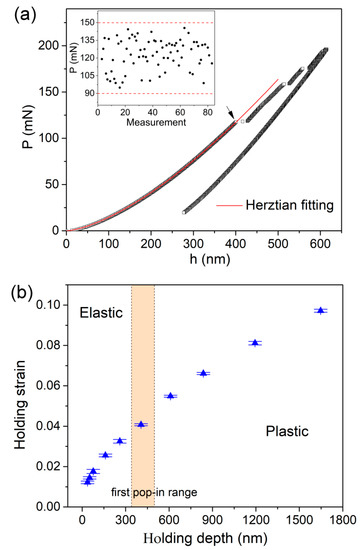(a) The typical P-h curve under 200 mN spherical indenter with 5 s holding. The distribution range of the critical load at the first pop-in event is shown in the inset, which was plotted with measurement. (b) The corresponding holding strain for each holding load was calculated for spherical nanoindentation and was plotted with holding depth. The creep tests could be divided as elastic holding and plastic holding.