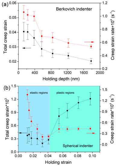 The total creep strain in the end of holding stage and strain rate of steady-state creep were estimated for (a) Berkovich and (b) spherical indenters, which were plotted with holding depth and holding strain.