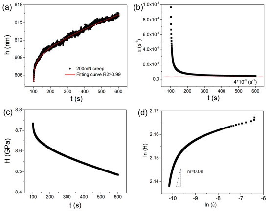 The present creep feature under nanoindentation was similar to conventional testing. Hence, it has merits to estimate strain rate sensitivity (SRS) in order to reveal the creep mechanism and its correlation with nanoindentation length scale. Here, we selected 200 mN-holding testing by spherical indenter as an illustration to calculate SRS. As exhibited in Figure 5a, creep curve could be perfectly fitted (R2 > 0.99) by an empirical law: