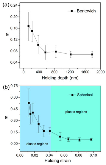 Strain rate sensitivities were plotted with holding depth for (a) a Berkovich indenter and plotted with holding strain for (b) a spherical indenter.