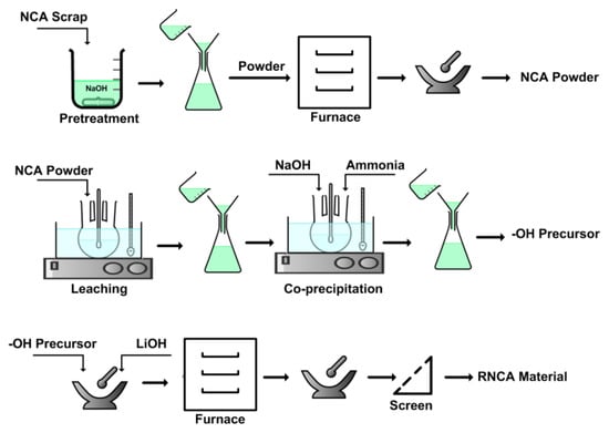 Next, the precursor was mixed with LiOH (Merck, Darmstadt, Germany) using a mortar and pestle until homogeneity was achieved. The molar ratio of Li to metal ions was adjusted to 1.03:1 using the hydroxide salts of metals. Then, the mixture was calcined at 550 °C for 6 h and was further sintered at 800 °C for 12 h under an oxygen stream in a muffle furnace. Finally, the NCA material was obtained. The NCA material was ground and screened into fine NCA particles (referred to here as Recycled NCA or RNCA). A flow chart of the RNCA synthesis appears in Figure 1, in which the leaching processes of RNCA using hydrochloric acid, nitric acid, and sulfuric acid are denoted RNCA-HA, RNCA-NA, and RNCA-SA.