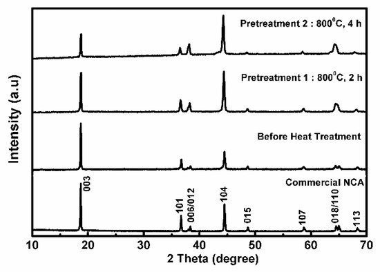 A previous study reported that CO2 gas was formed during the heat treatment process. This occurrence was caused by the redox reaction between acetylene black (AB) and the cathode material during which the transition metals were reduced from a high charge to a low charge [49]. For NCA material, the oxidation states of the transition metals are trivalent (Li+, M3+, O4-). When the reduction reaction occurs, the state of the transition metals changes from trivalent to a divalent state. To verify the redox reaction and the effect of heat treatment on the NCA structure, the collected powders (P-01 and P-02) were analyzed using XRD.